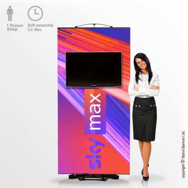 Our TV display banner stand is a strong single sided free standing unit with an integral 22 inch - 50 inch TV. It is an excellent way to promote or marketing your products in a busy environment such as a shop floor or exhibition venues. The graphic is 2.13m high and 100cm wide and printed to a high resolution colour on waterproof media. This display banner stand is for indoor use only.