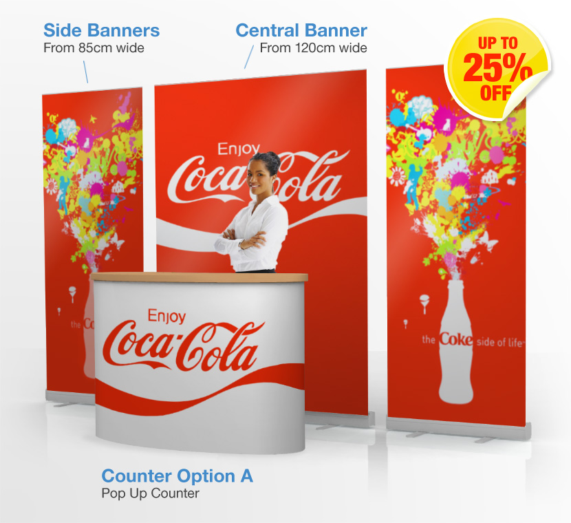 The term marketing stands encompasses a number of different display items, including stands for exhibitions, portable sales and promotions, advertising for products and services, and many more. We specialise in portable marketing stands that can be transported easily to events as standalone marketing displays, or as a small part of a larger display. For example, as part of a campaign to promote a product or service, a business will often exhibit at an event designed to promote a specific industry. These industry events, or trade shows, require any number of exhibiting stands and displays to aid in the promotion of the business. Banner stands, pop up stands and promotional counters can all be classed as marketing stands as they can be used as part of a marketing campaign designed to increase business.